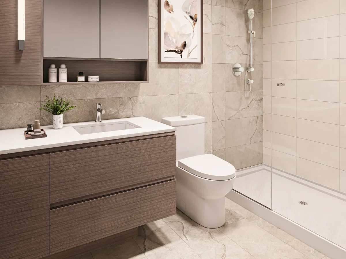 Durable quartz countertops and timeless porcelain floor, bath, and shower wall tiles